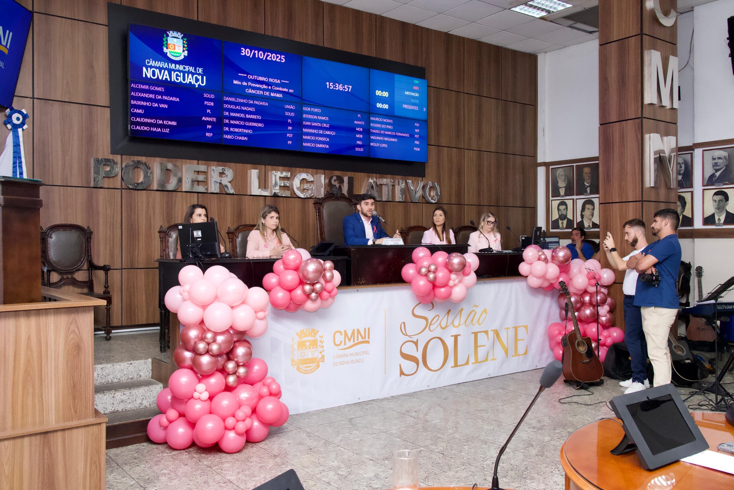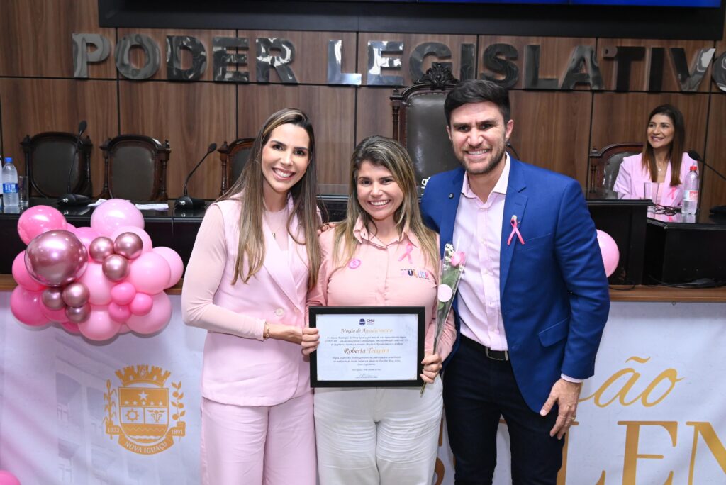 A Câmara Municipal de Nova Iguaçu promoveu, na última quinta-feira (30/10)uma Sessão Solene em alusão ao Outubro Rosa — campanha que mobiliza pela conscientização sobre o câncer de mama e a importância da prevenção. A solenidade, presidida pelo presidente da Casa, Dr. Marcio Guerreiro, com a participação da vice-prefeita Dra. Roberta e da secretária de Assistência Social (Semas), Elaine Medeiros, contou com a presença de autoridades municipais, representantes da sociedade civil, profissionais de saúde e mulheres que venceram ou estão enfrentando o câncer de mama.